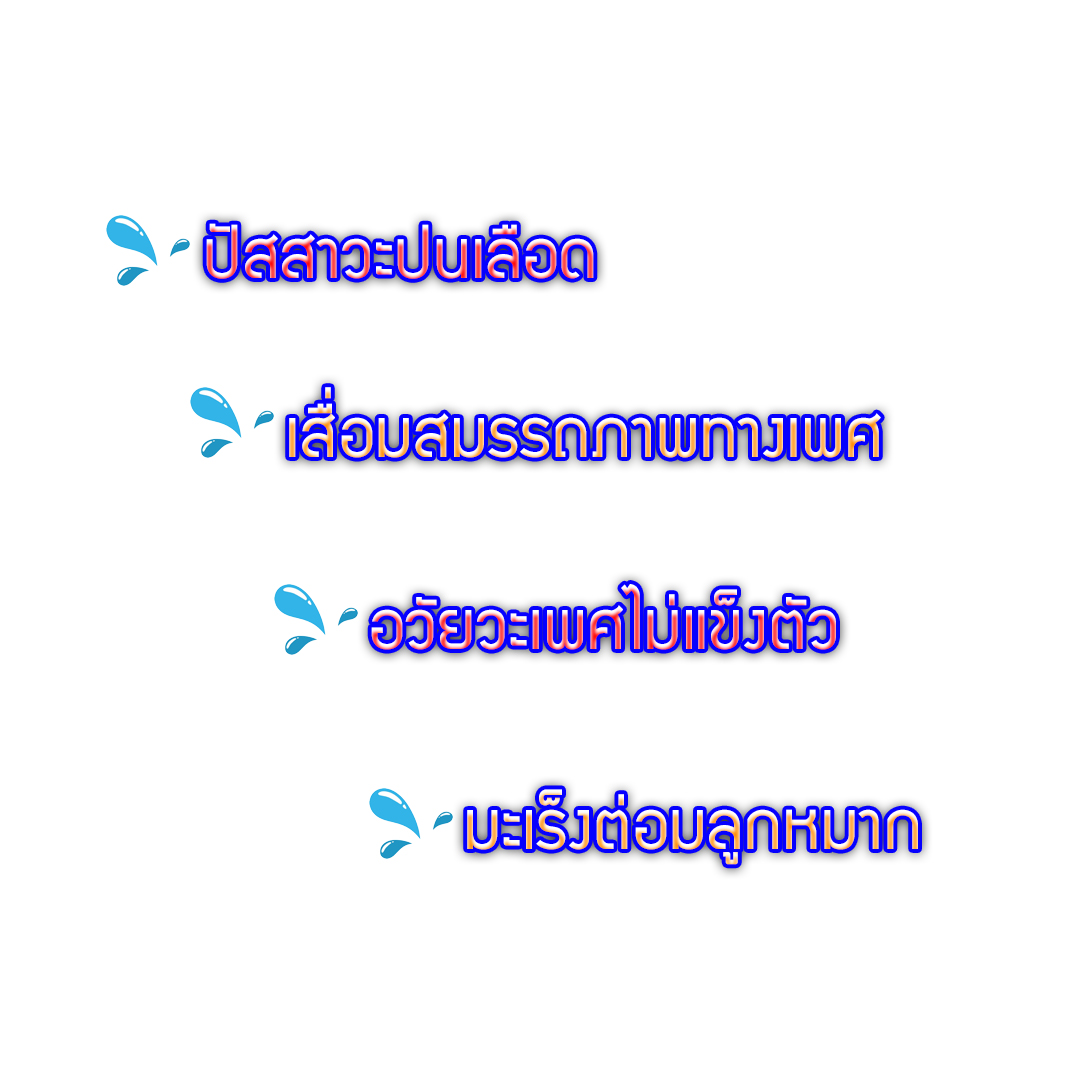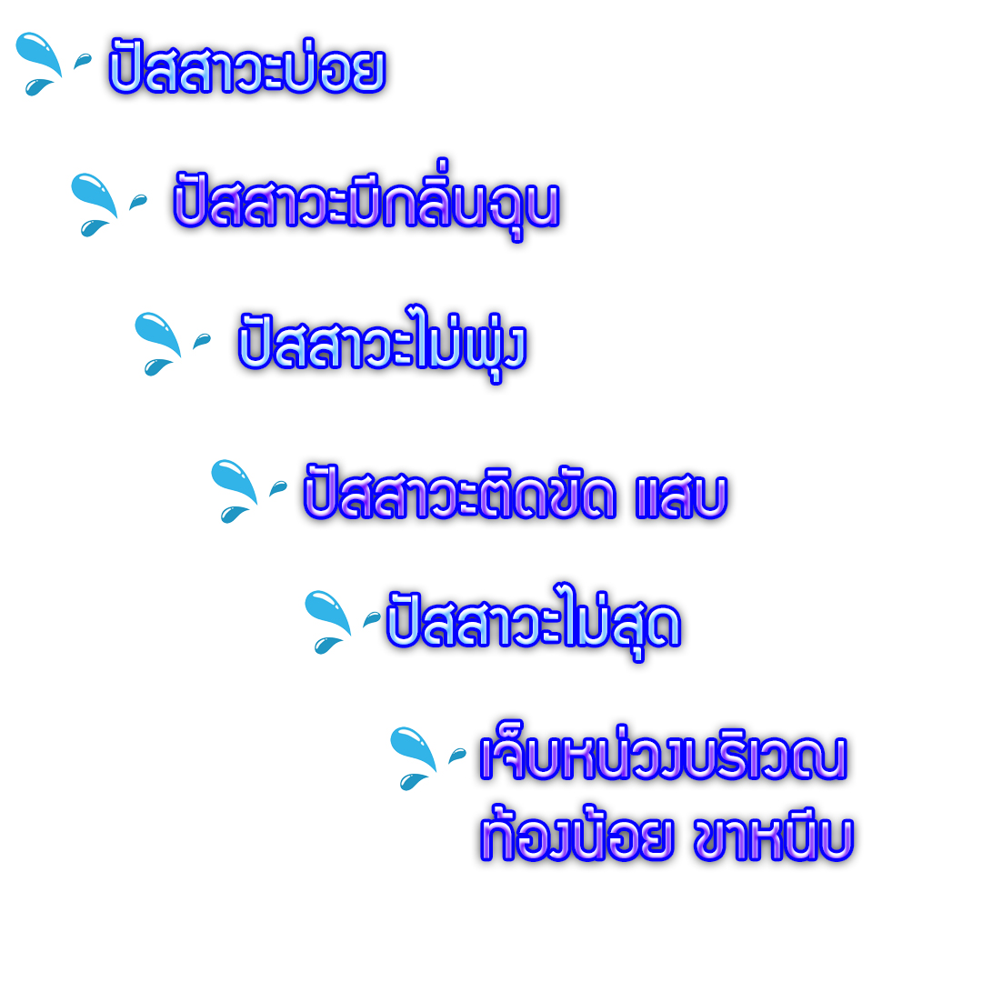 ปัสสาวะบ่อย | ปัสสาวะไม่พุ่ง | ปัสสาวะติดขัด แสบ | ปัสสาวะไม่สุด | เจ็บหน่วงบริเวณท้องน้อย ขาหนีบ | ปัสสาวะเป็นเลือด | เสื่อมสมรรถภาพทางเพศ | อวัยเพศไม่แข็งตัว | มะเร็งต่อมลูกหมาก