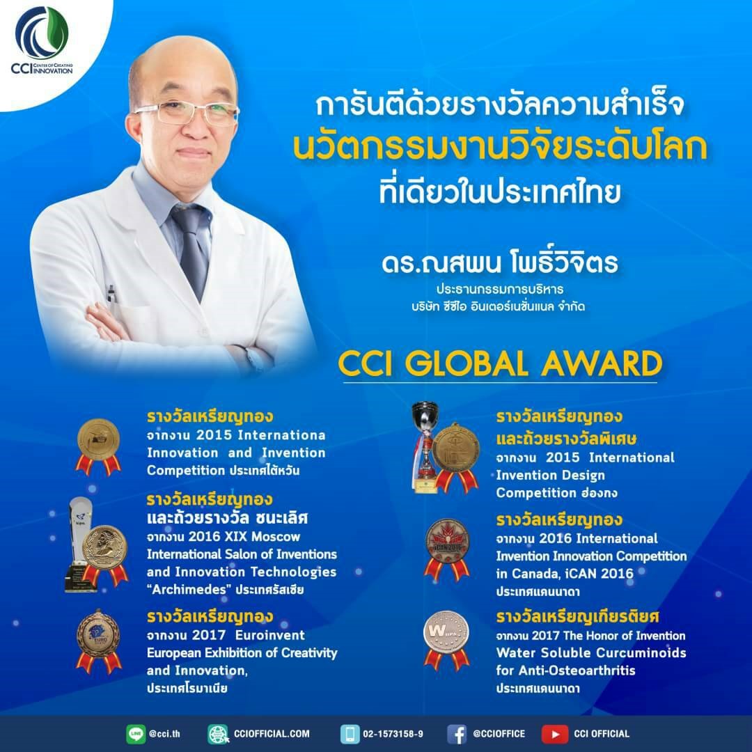 เชื่อมั่น มั่นใจ ปลอดภัย ในผลิตภัณฑ์ของบริษัท CCi ด้วยการการันตีรางวัล นวัตกรรมงานวิจัยสมุนไพรไทยระดับโลก กว่า 21 เหรียญทอง ที่เดียวในประเทศไทย โดย ดร.ณสพน โพธิ์วิจิตร ประธานกรรมการบริหาร บริษัท ซีซีไอ อินเตอร์เนชั่นแนล จำกัด